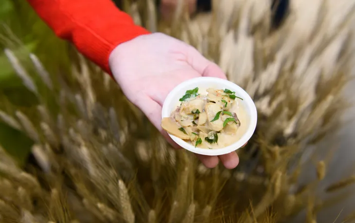 Dresser les champignons en petites assiettes et déposer une tranche de magret