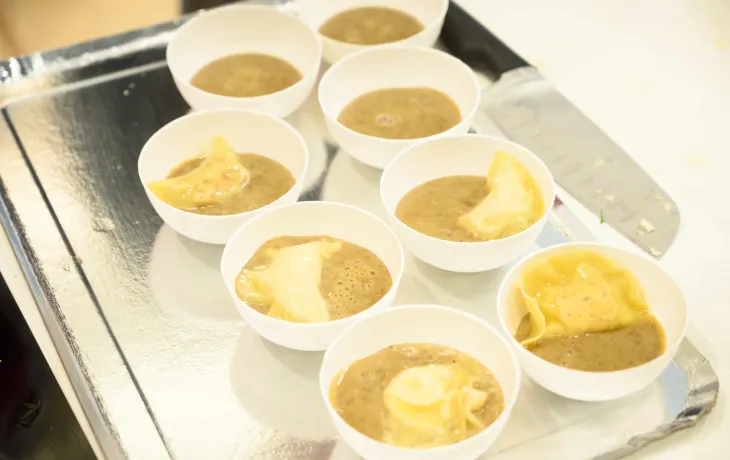 Servir les ravioles en petits bols, servir avec le velouté de lentilles et décorer avec